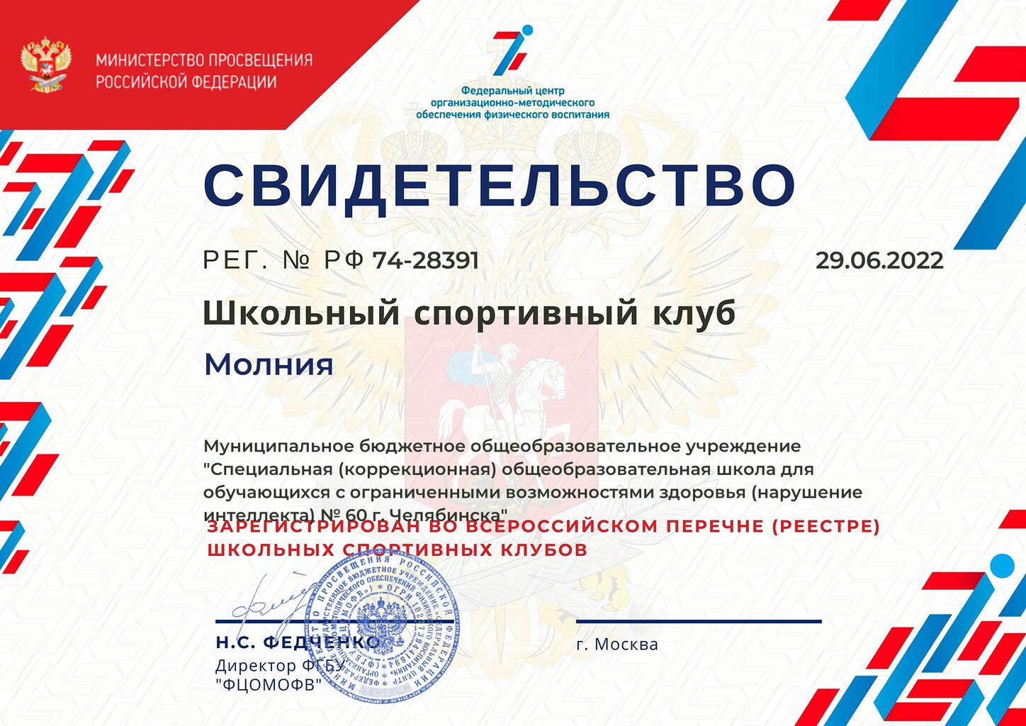 - Приказ "О создании школьного спортивного клуба "МОЛНИЯ" МБОУ"С(К)ОШ №60 г. Челябинска"